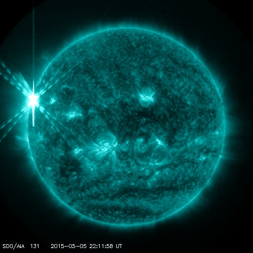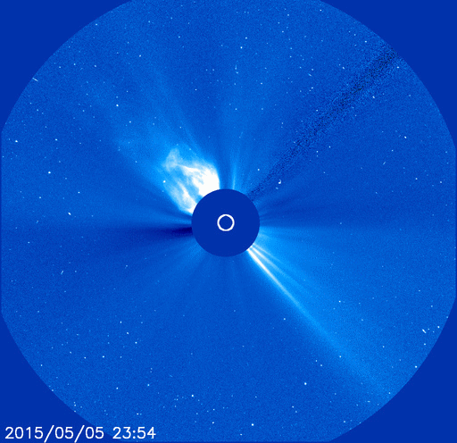 La explosión ha generado una nueva eyección de masa coronal que viaja a 1100 km/s. Se ha producido una tempestad magnética moderada (ver portada del blog: Indice Kp) y un blackout de radio en las cercanías de la frecuencia de 20Mhz. A continuación vemos la animación gif publicada por Spaceweather.com (cortesía)